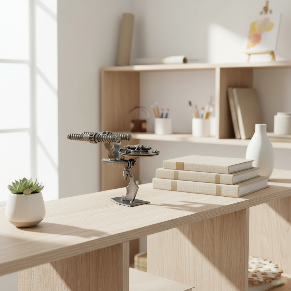 Die Kombination aus Handwerkskunst, Nachhaltigkeit und popkultureller Ikone macht dieses Werk zu einem ganz besonderen Sammlerstück. Hol dir ein Stück Sternenflotte – aus Altmetall neu erschaffen.