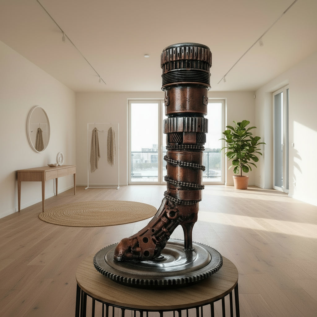 Die geschwungenen Formen eines klassischen Stilettos wurden mit höchster Präzision nachgebildet, wodurch ein faszinierendes Zusammenspiel aus technischer Raffinesse und femininer Eleganz entsteht. Die detailreiche Verarbeitung sorgt für eine beeindruckende Optik, während die hochwertige Lackierung das Metall schützt und ihm einen edlen Glanz verleiht. Das Zusammenspiel aus rauen, industriellen Elementen und der stilvollen Silhouette macht diesen High Heel zu einem einzigartigen Kunstobjekt, das sowohl modern als auch