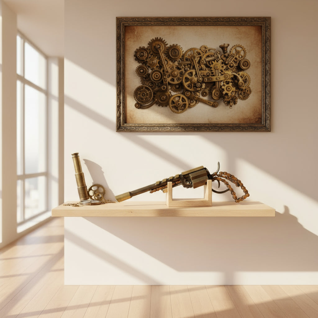 Jede einzelne Metallkomponente wurde sorgfältig ausgewählt und so angeordnet, dass das Design nicht nur authentisch wirkt, sondern auch eine markante, rustikale Optik erhält. Die filigrane Anordnung der einzelnen Metalle und Ketten verleiht diesem Revolver eine dynamische Ausstrahlung, während die dunkle, gealterte Metalloberfläche den rauen, antiken Look verstärkt. Die geschwungenen und robusten Formen verleihen ihm eine harmonische Mischung. Erhältlich in lackiert oder blank.