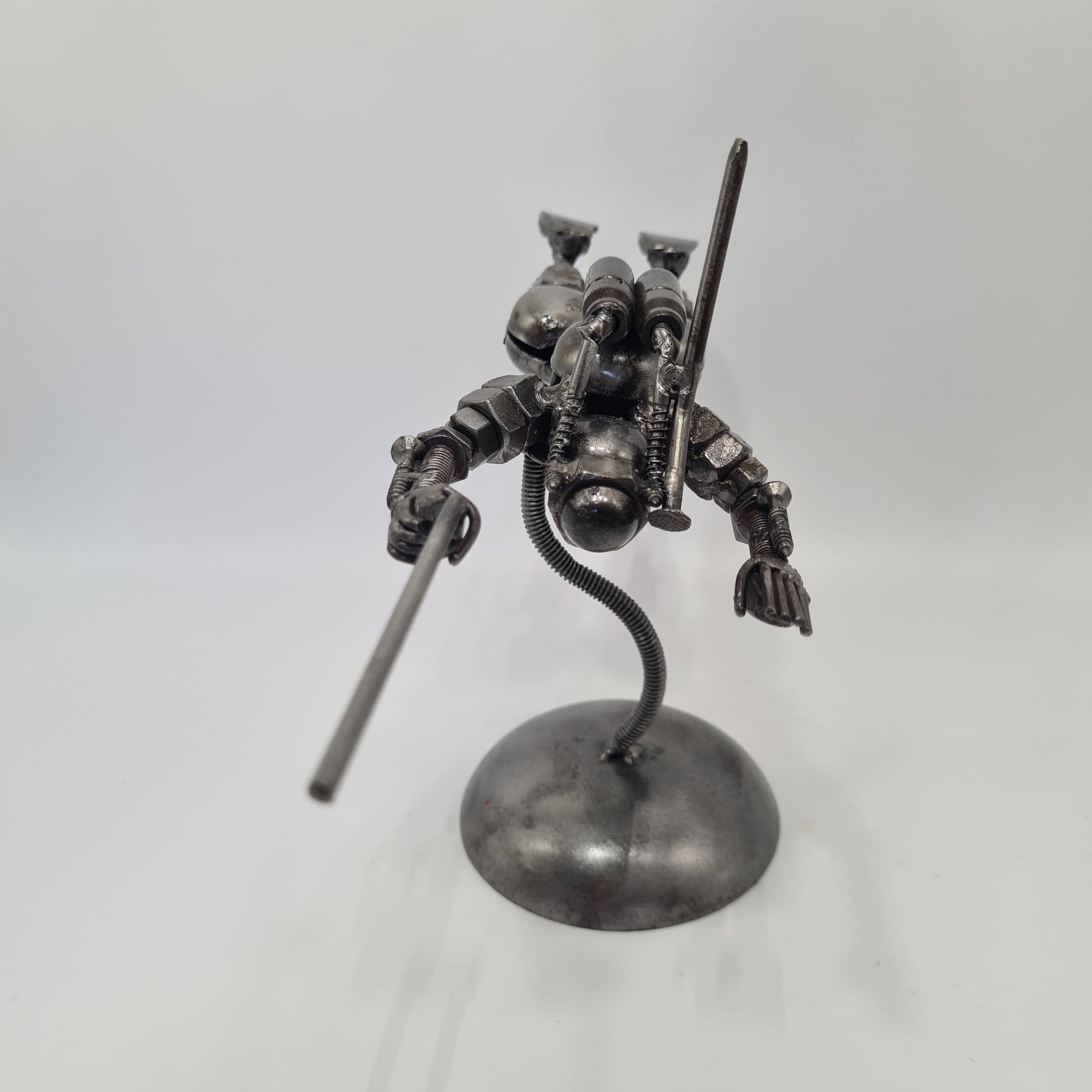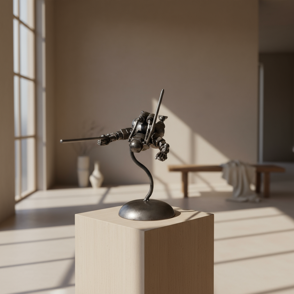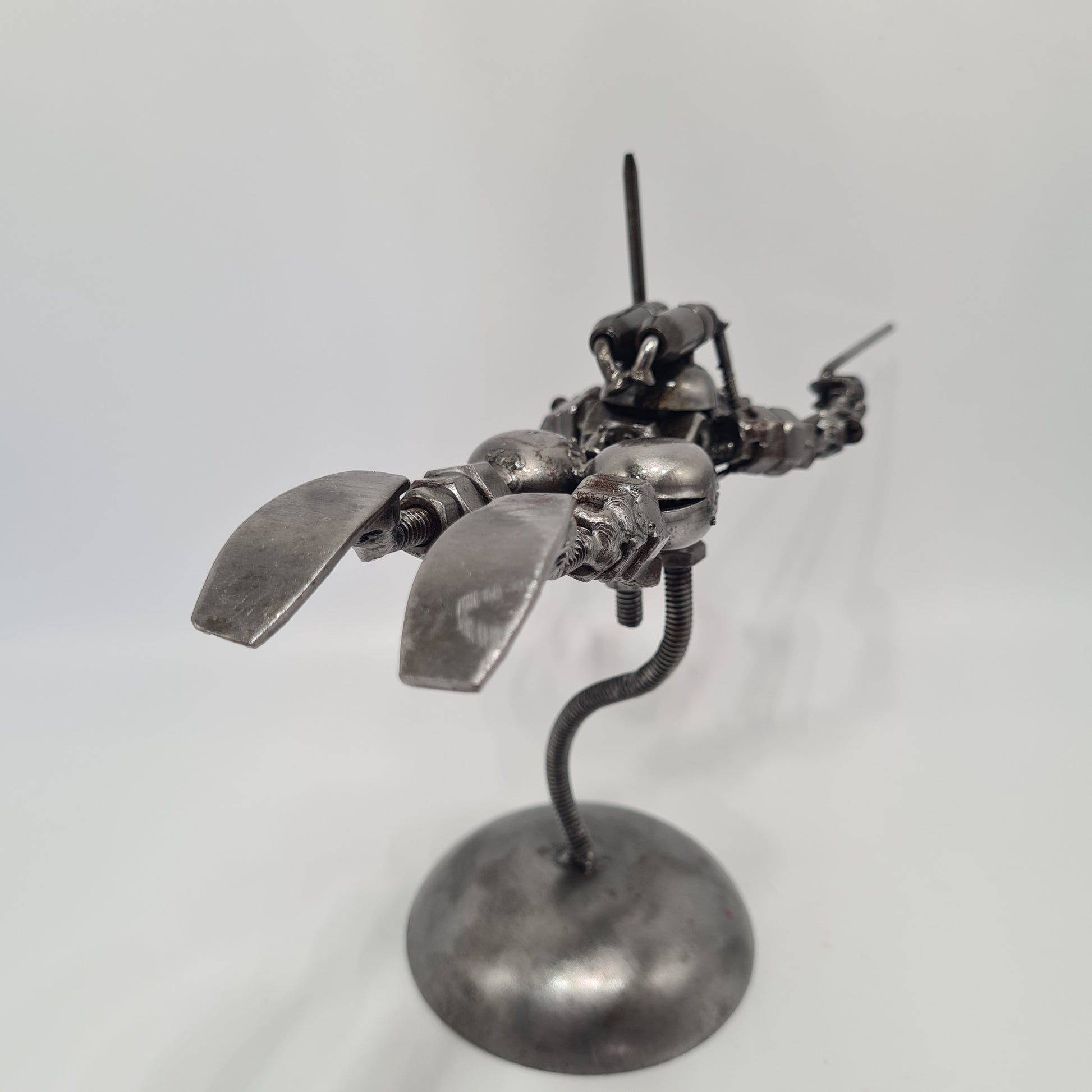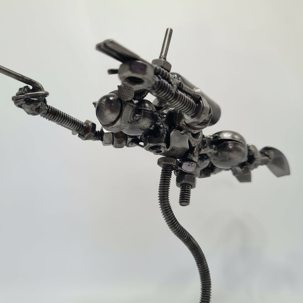 Ob im Wohnzimmer, Büro oder in der Vitrine – diese recycelte Metallfigur zieht garantiert alle Blicke auf sich und erzählt ihre ganz eigene Geschichte von Wiederverwertung und Kreativität.