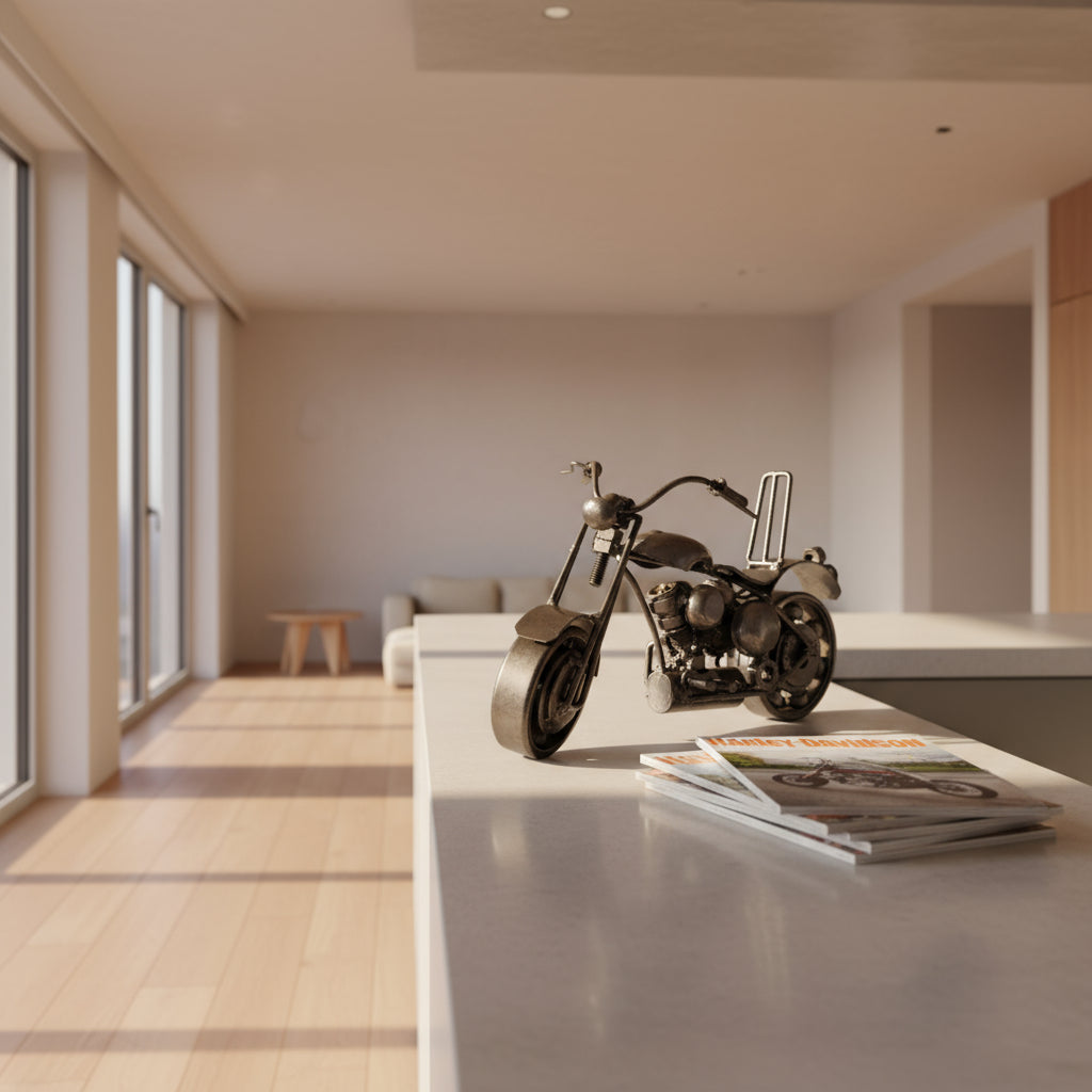 Beim Anblick dieses handgefertigten Choppers kann man sich förmlich vorstellen, wie er mit seinem tiefen Dröhnen über endlose Straßen gleitet, begleitet vom warmen Licht eines goldenen Sonnenuntergangs. Die geschwungene Form des Rahmens, der verlängerte Lenker und die massiven Räder lassen die Ästhetik legendärer Maschinen wieder aufleben. Das fein gearbeitete Metall mit seinen rostigen und polierten Oberflächen verleiht dem Kunstwerk eine authentische Patina, die es noch ausdrucksstärker macht