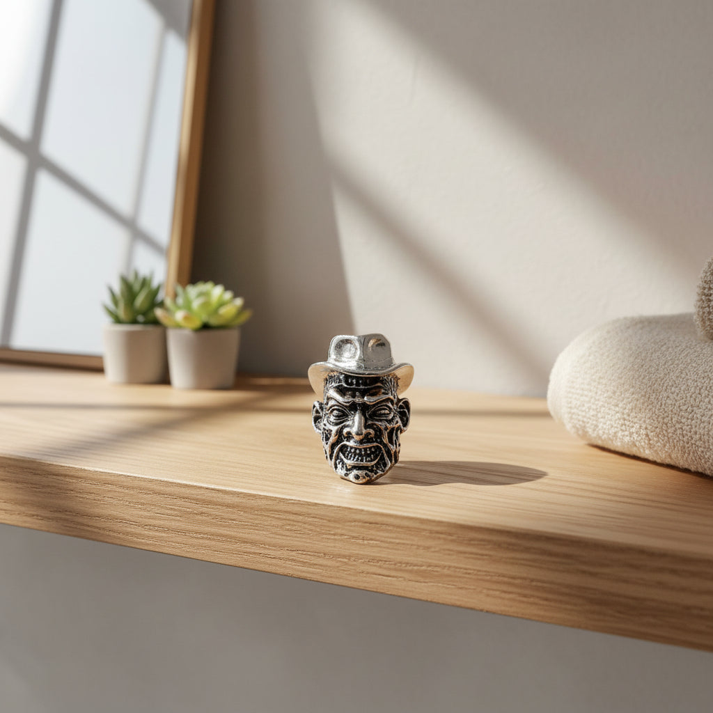 Betreten Sie die düstere Welt der Horrorikonen mit unserem einzigartigen Upcycling Freddy Krueger Ring, handgefertigt aus hochwertigem Altmetall. Dieser Ring ist nicht nur ein Schmuckstück, sondern auch eine Hommage an den legendären Albtraum-Krieger aus der Nightmare on Elm Street-Serie.