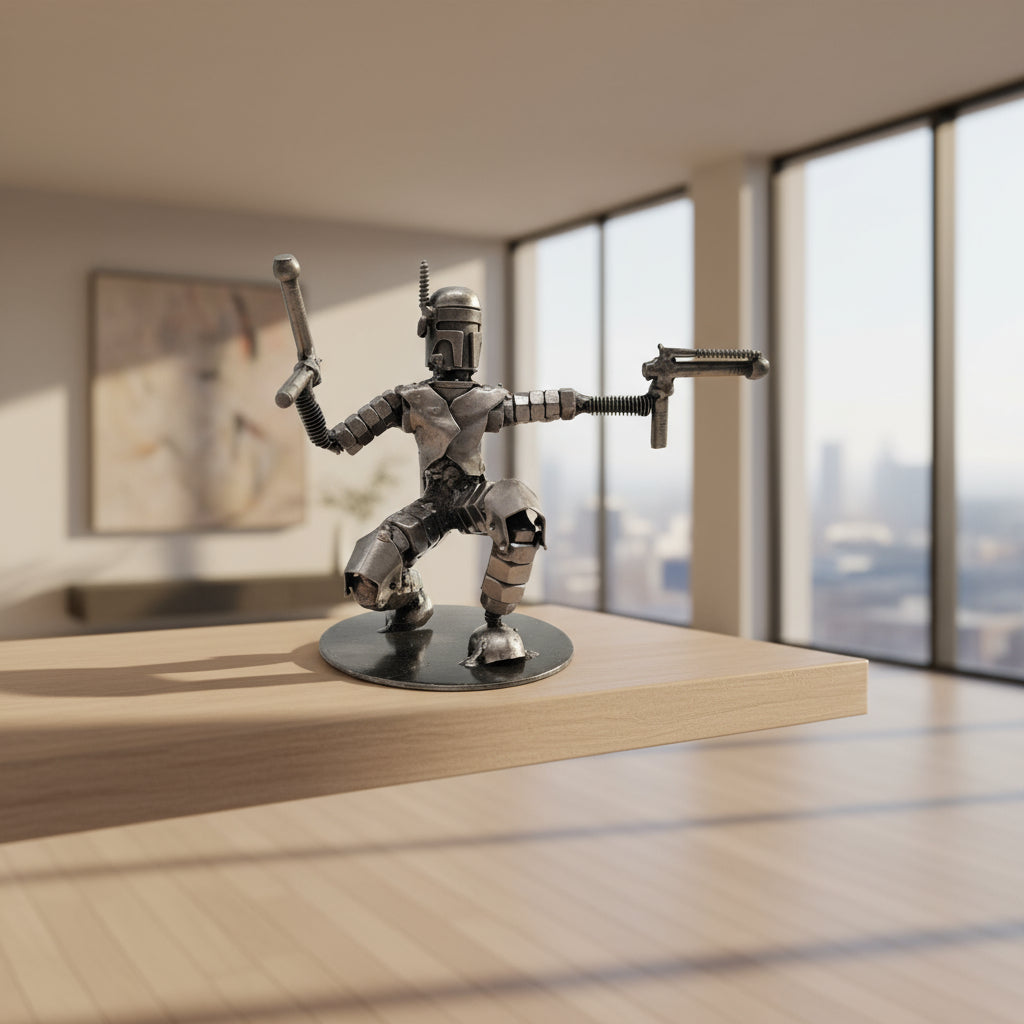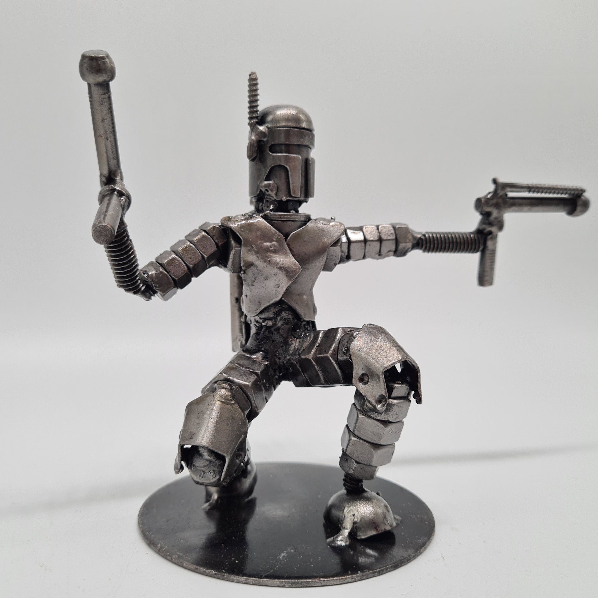 Jango Fett war einer der bekanntesten und einflussreichsten menschlichen Kopfgeldjäger zu Zeiten der galaktischen Republik. Er wurde im Auftrag des Sith-Lords Darth Tyranus der Genspender für die Klonarmee und war an ihrer Ausbildung auf der Meereswelt Kamino beteiligt. Diese Figur wurde angelehnt an die Star Wars Filme nachempfunden. Keines Unserer Kunstwerke gleicht dem anderen jeder ist ein einmaliges Objekt. Es wird ausnahmslos Altmetall, Schrott und alte KFZ Teile verwendet. Die Figur hat keine beweglichen Teile.