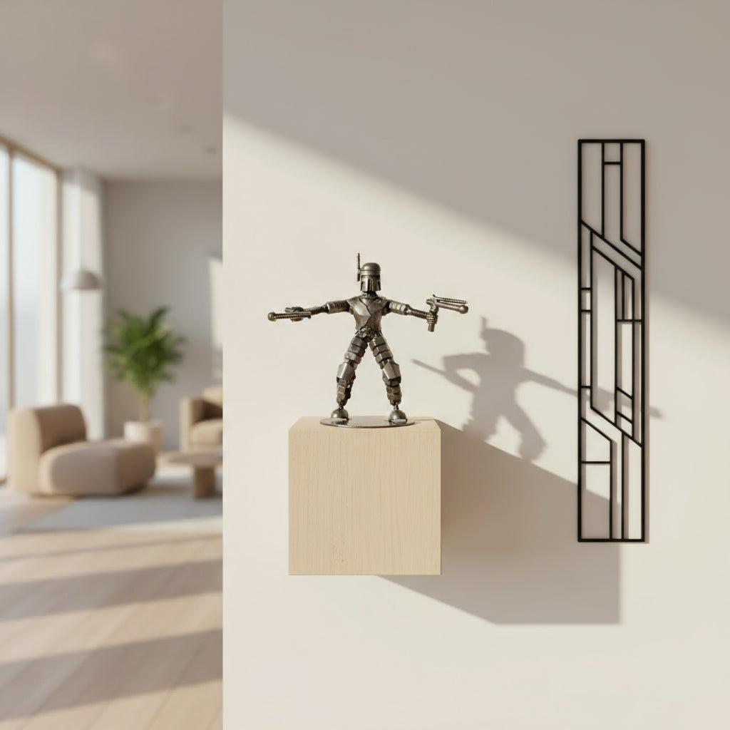 Jango Fett war einer der bekanntesten und einflussreichsten menschlichen Kopfgeldjäger zu Zeiten der galaktischen Republik. Er wurde im Auftrag des Sith-Lords Darth Tyranus der Genspender für die Klonarmee und war an ihrer Ausbildung auf der Meereswelt Kamino beteiligt. Diese Figur wurde angelehnt an die Star Wars Filme nachempfunden. Keines Unserer Kunstwerke gleicht dem anderen jeder ist ein einmaliges Objekt. Es wird ausnahmslos Altmetall, Schrott und alte KFZ Teile verwendet. Die Figur hat keine beweglichen Teile.