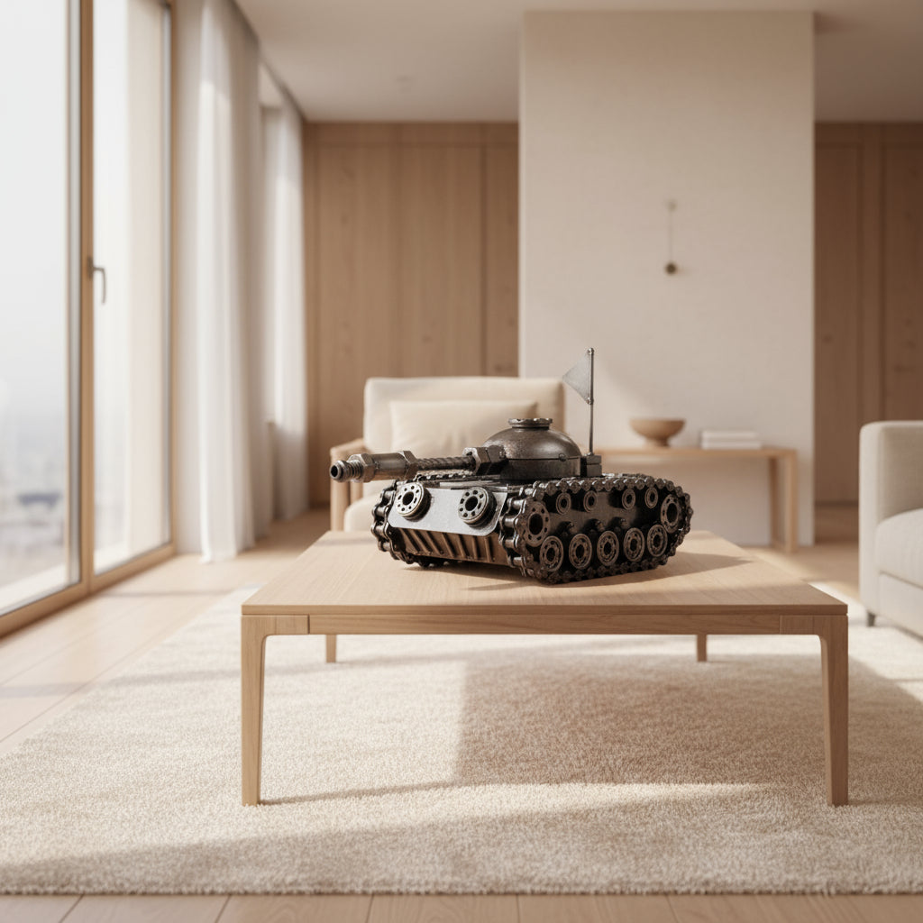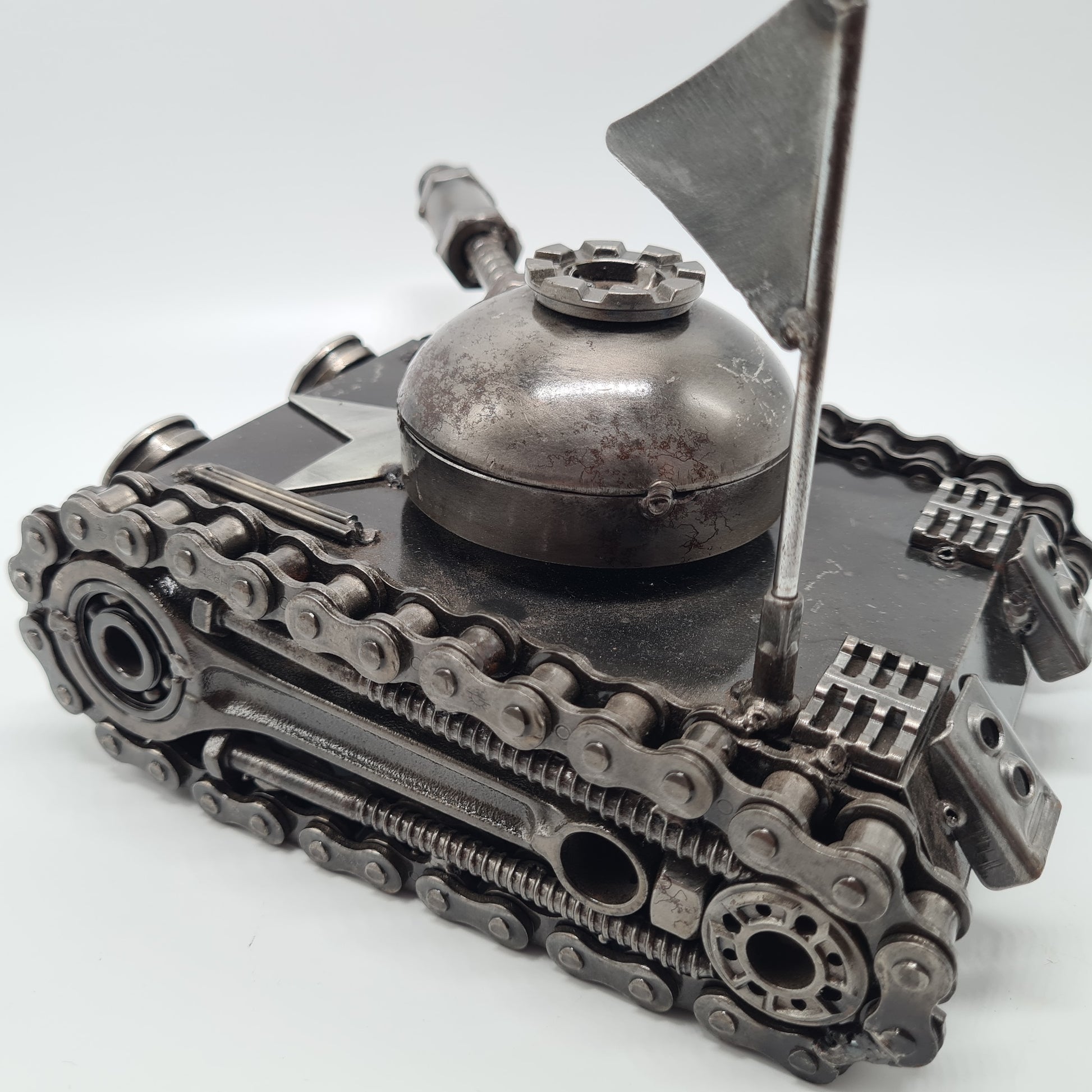 Das Design dieser Figur ist von den charakteristischen Merkmalen eines Kettenpanzers inspiriert. Feine Gravuren und präzise Details auf dem Schrottmetall schaffen eine authentische und kraftvolle Ausstrahlung. Das Geschossteil lässt sich drehen und die Fahne ist als Sonderzubehör ebenfalls abnehmbar.