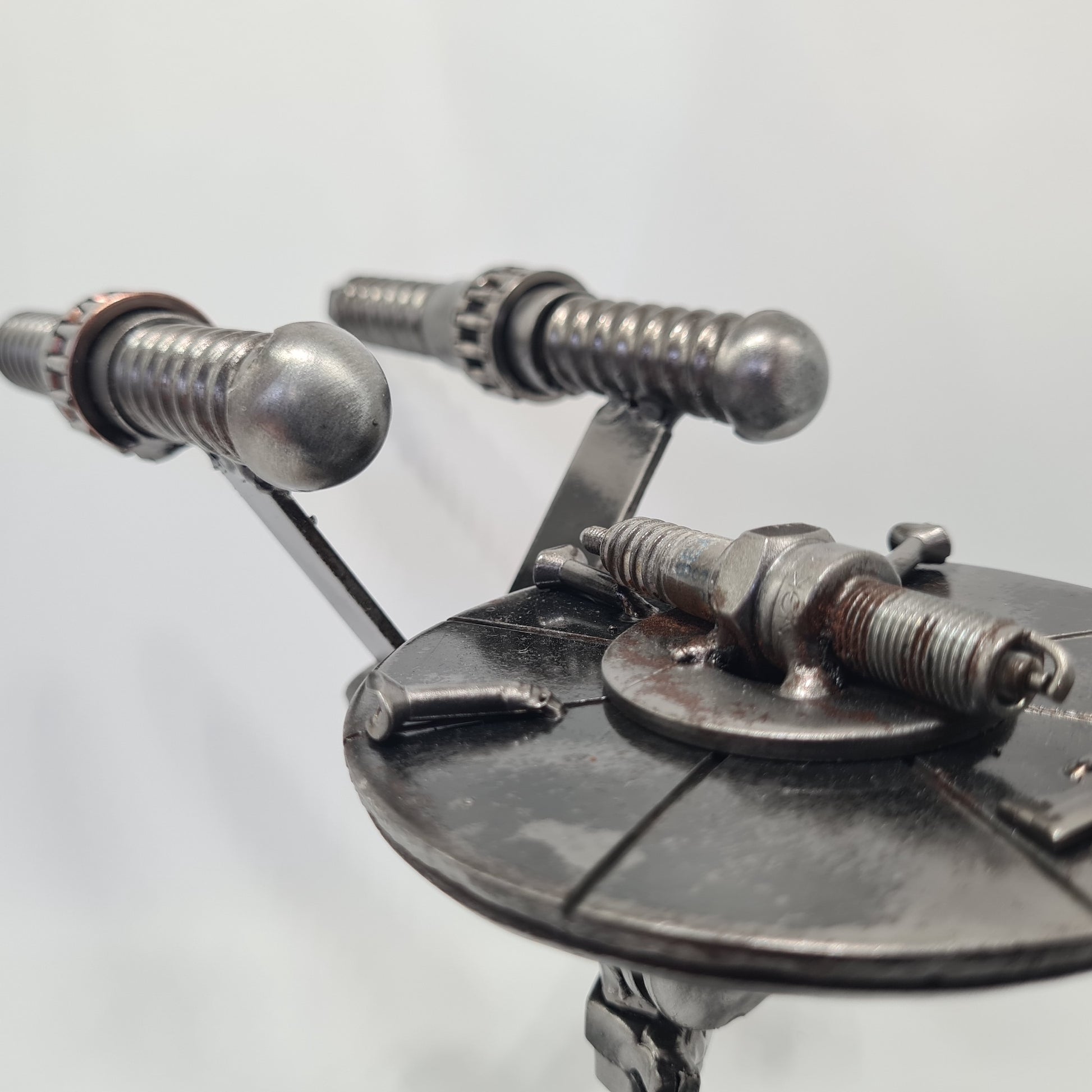 Diese detailreiche Enterprise Skulptur ist eine Hommage an das legendäre Star Trek Raumschiff – handgefertigt aus recyceltem Altmetall. Jede Figur wird in aufwendiger Handarbeit aus alten Fahrzeug- und Werkzeugteilen gefertigt. Schrauben, Zahnräder, Federn und Ketten werden zu einem faszinierenden Kunstwerk vereint, das futuristisches Design mit industriellem Charme verbindet.