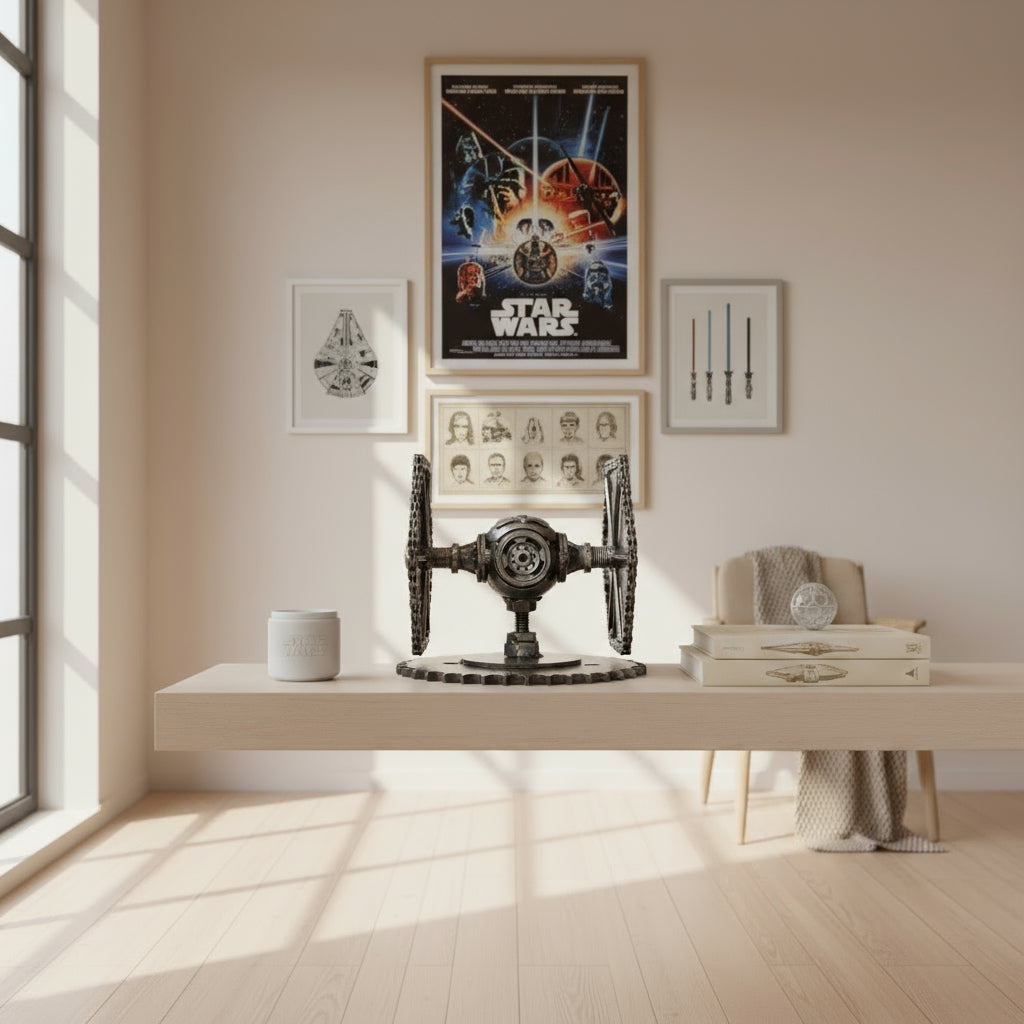 Dieser einzigartige Tie Fighter ist nicht nur ein Blickfang für alle Saga Fans, sondern auch ein echtes Kunstwerk aus recyceltem Metall. In aufwendiger Handarbeit gefertigt, bestehen die einzelnen Elemente dieser Skulptur aus alten Fahrzeugteilen, Werkzeugen und Schrottmetall – jedes Stück ist ein Unikat mit Geschichte.